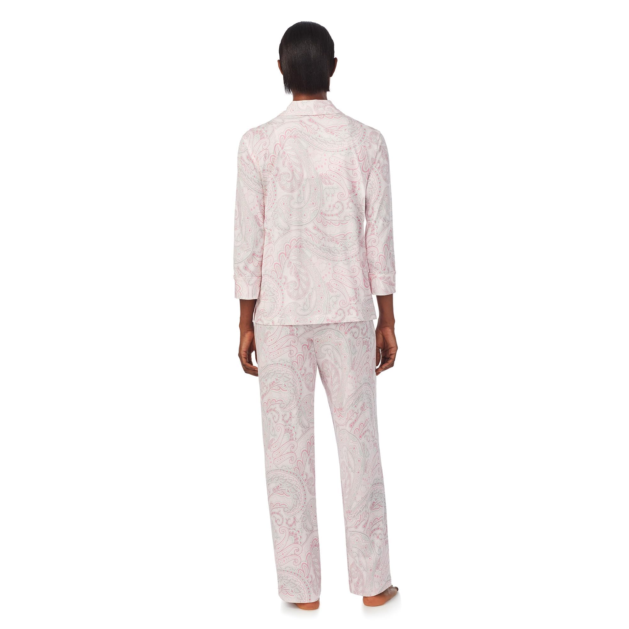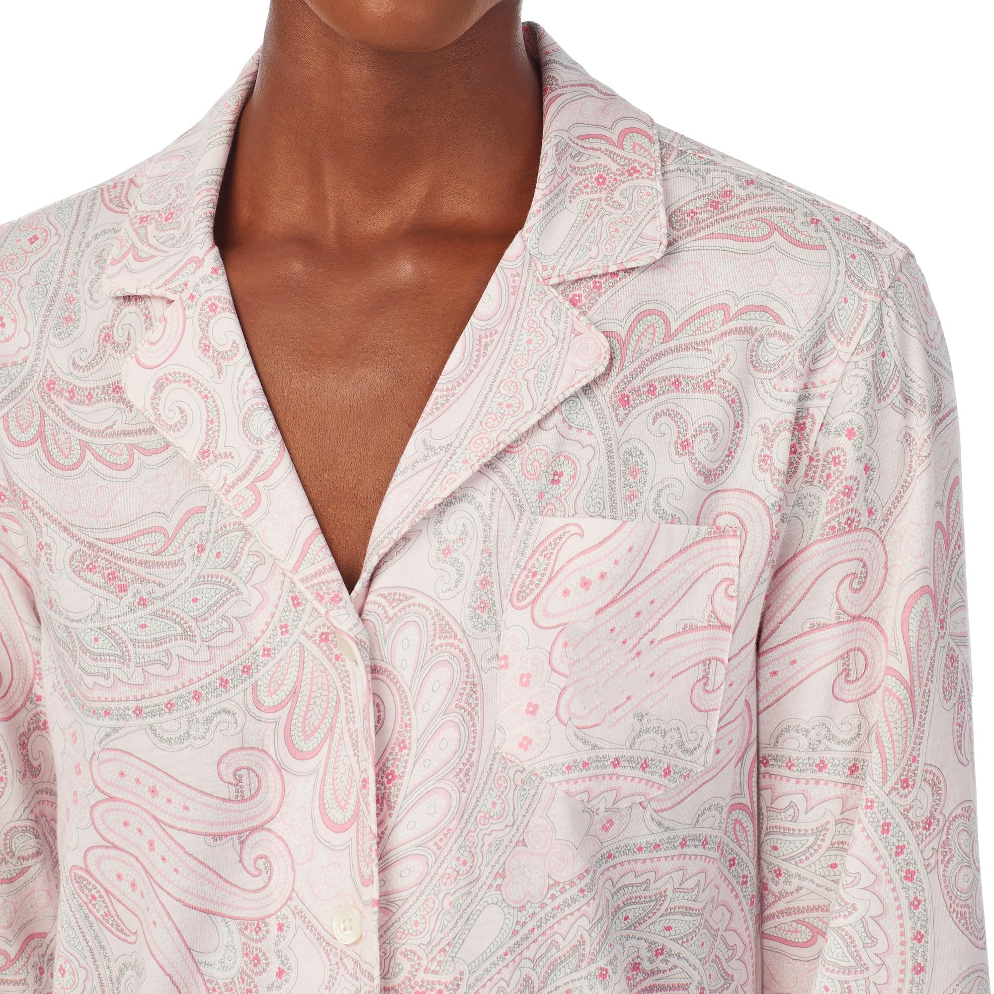 This pajama set features a soft white background with an elegant pink paisley print for a classic and feminine sleepwear look. The long sleeve top is designed with a notched collar and button-front closure, giving it a timeless pajama-inspired style that feels polished yet relaxed. The matching full-length pants complete the set with an easy straight-leg silhouette for comfortable everyday wear.