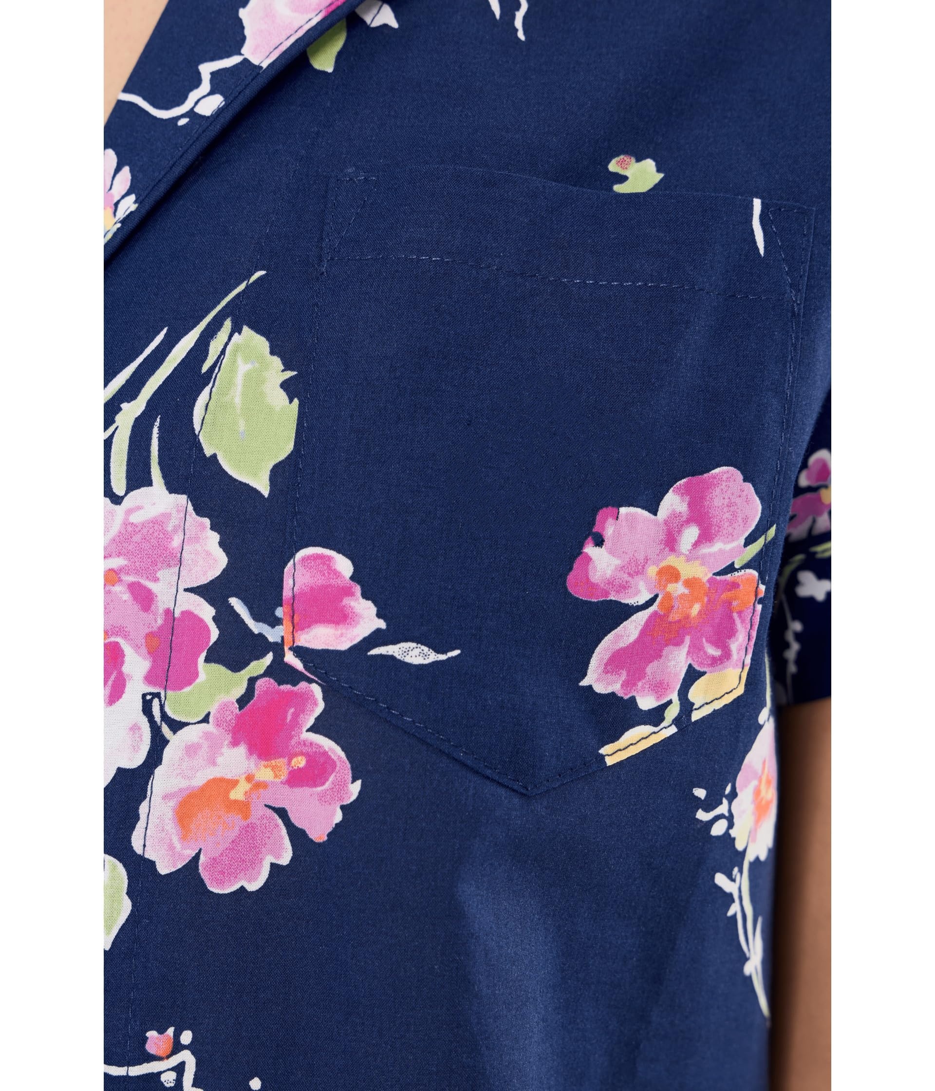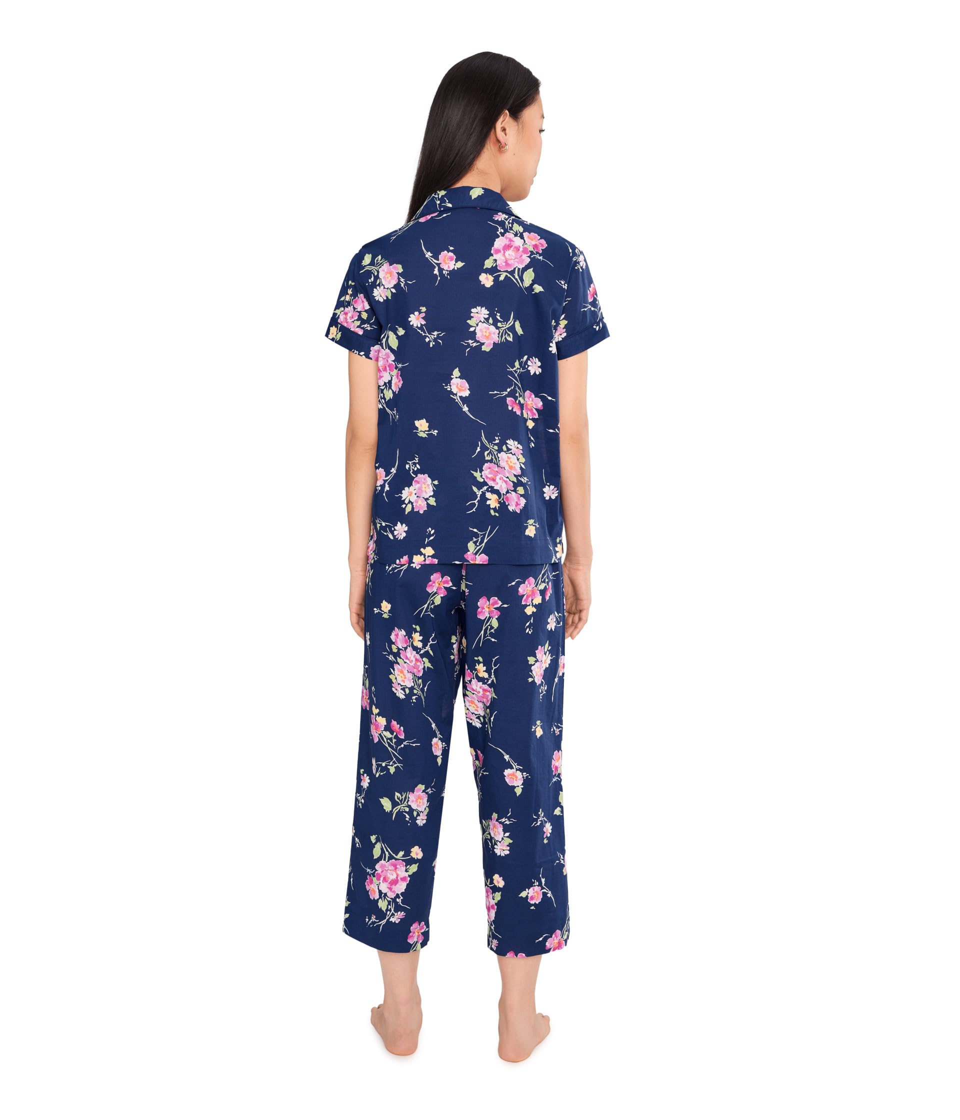 This pajama set features a deep navy blue base with an allover pink floral print and soft green leafy accents for a fresh, feminine look. The short sleeve top is styled with a classic notched collar and button-front closure, giving it a timeless pajama-inspired design that feels both polished and comfortable. The matching pants are cut in a relaxed straight-leg silhouette with a cropped length, making the set feel light, easy to wear, and ideal for everyday lounging.