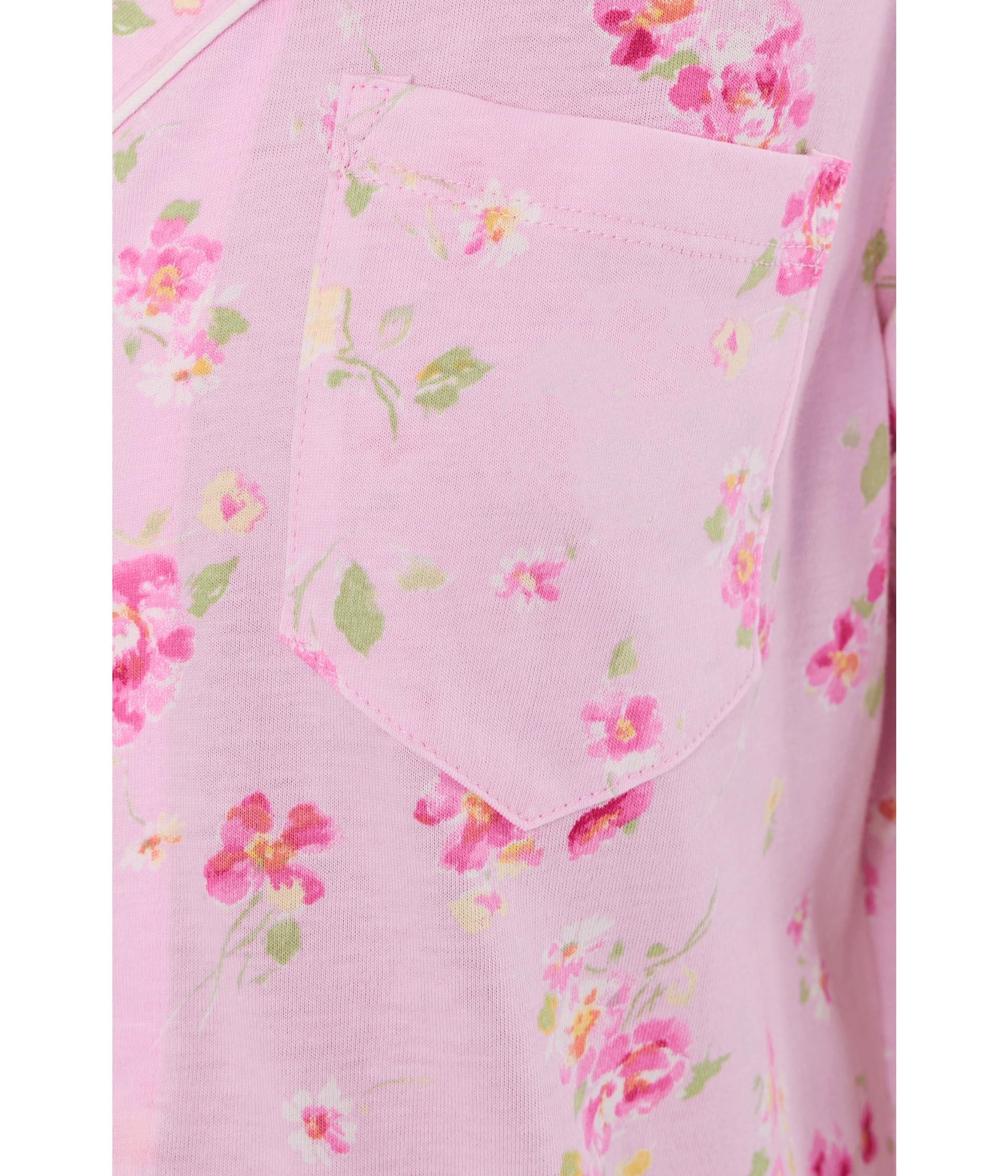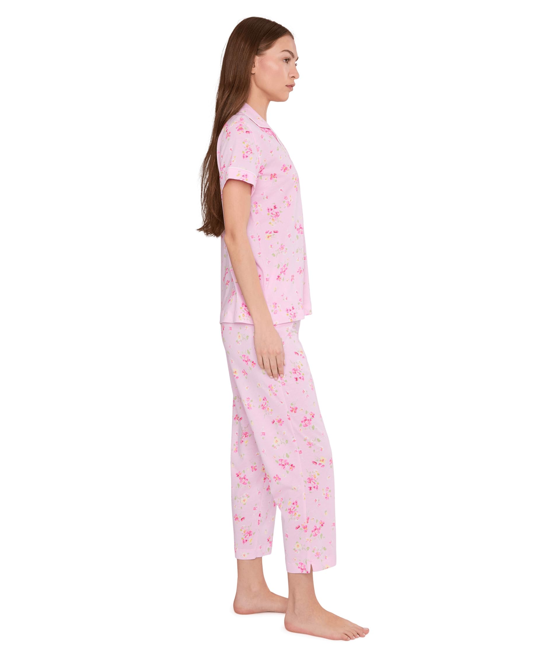 This pajama set features a soft pink color with an allover delicate floral print for a sweet and feminine sleepwear look. The short sleeve top is designed with a classic notched collar, button-front closure, and a relaxed fit that feels easy and comfortable to wear. The matching pants are finished in a cropped straight-leg silhouette, giving the set a light and casual feel that is perfect for everyday lounging and bedtime.