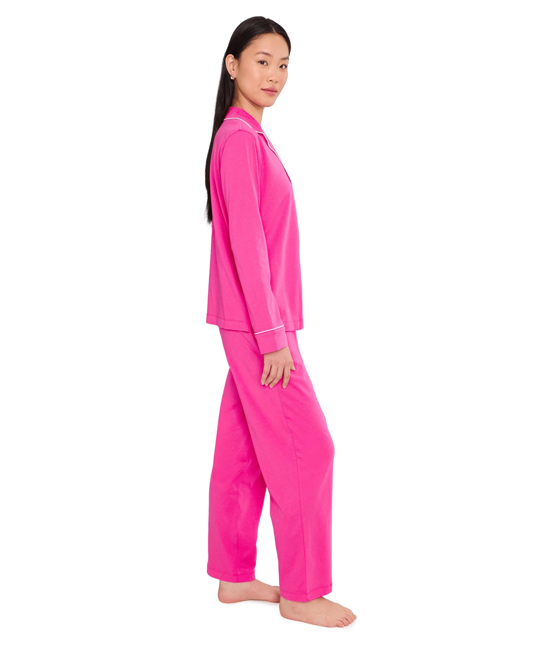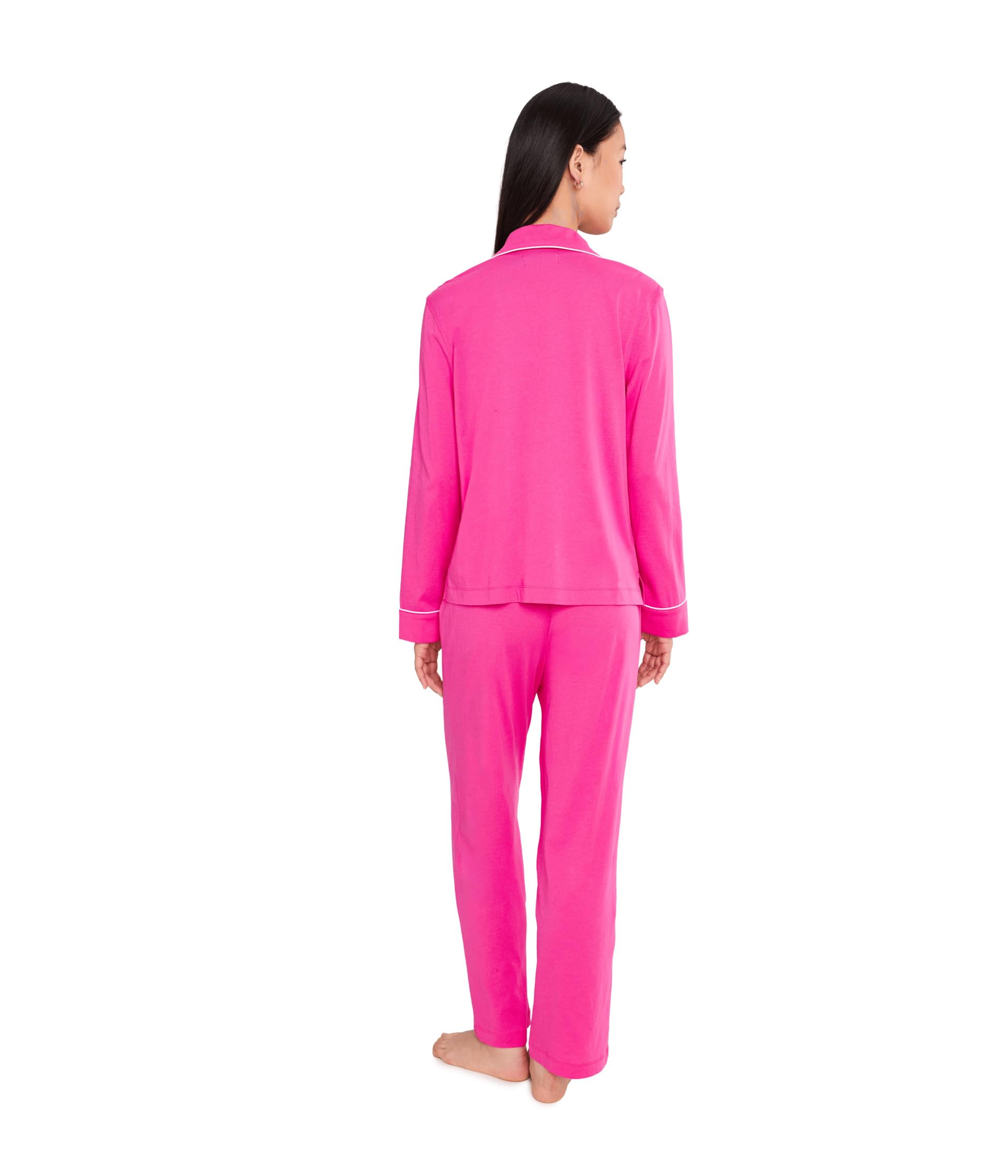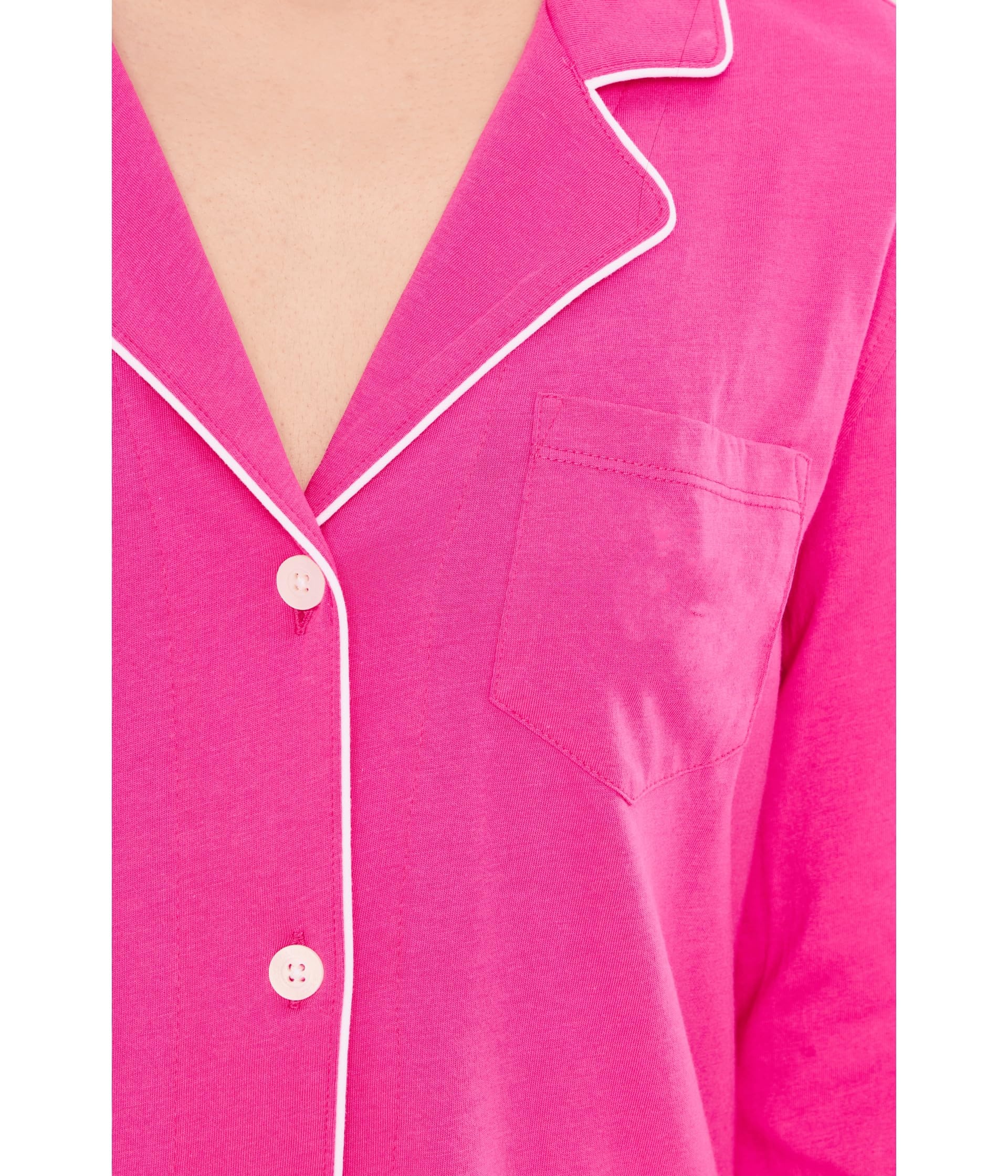 This pajama set features a vibrant hot pink color paired with crisp white contrast piping for a bold yet classic sleepwear look. The long sleeve top is styled with a notched collar, button-front closure, and a relaxed silhouette that feels polished and comfortable at the same time. A small embroidered detail at the chest adds a subtle finishing touch, while the matching full-length pants complete the set with an easy straight-leg shape for everyday wear.