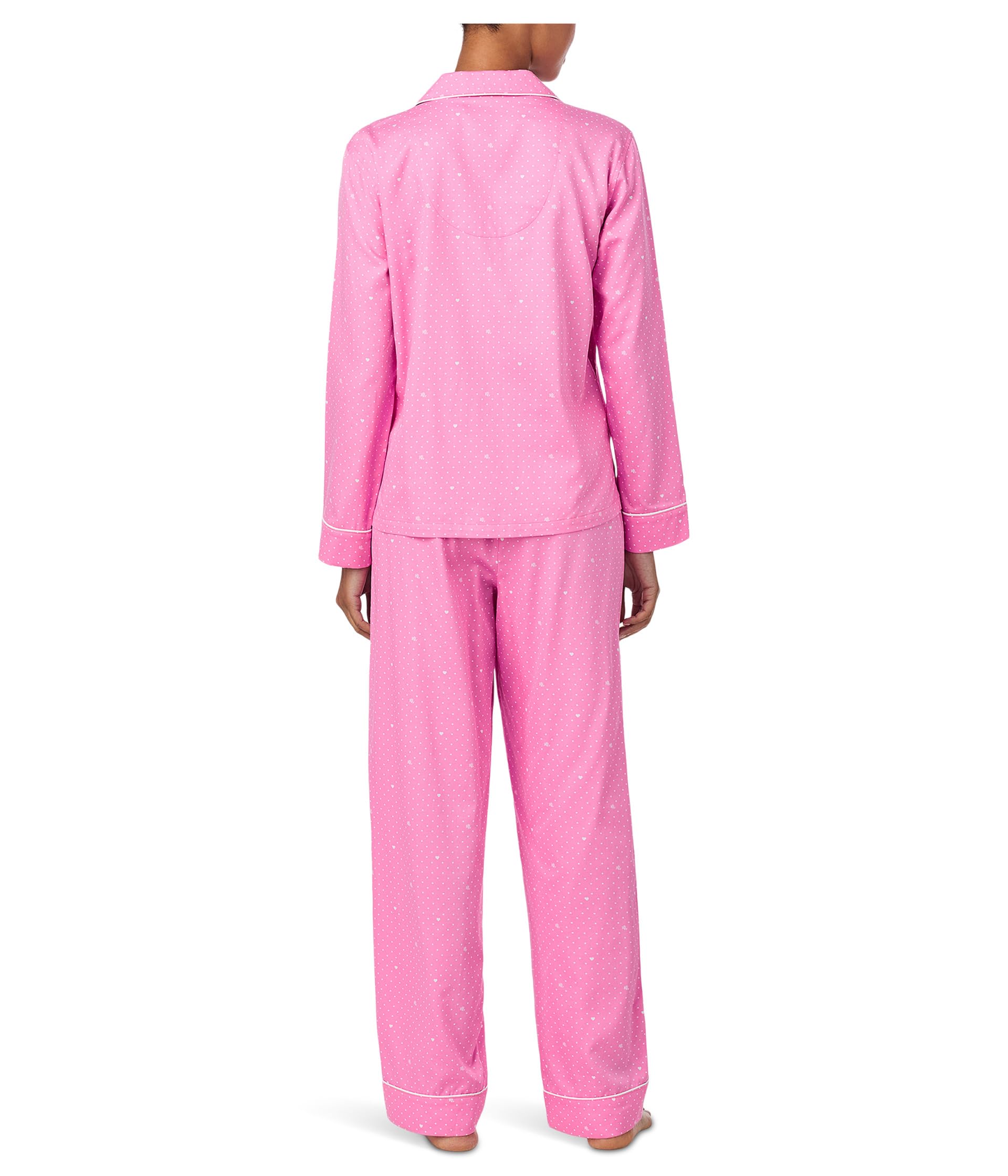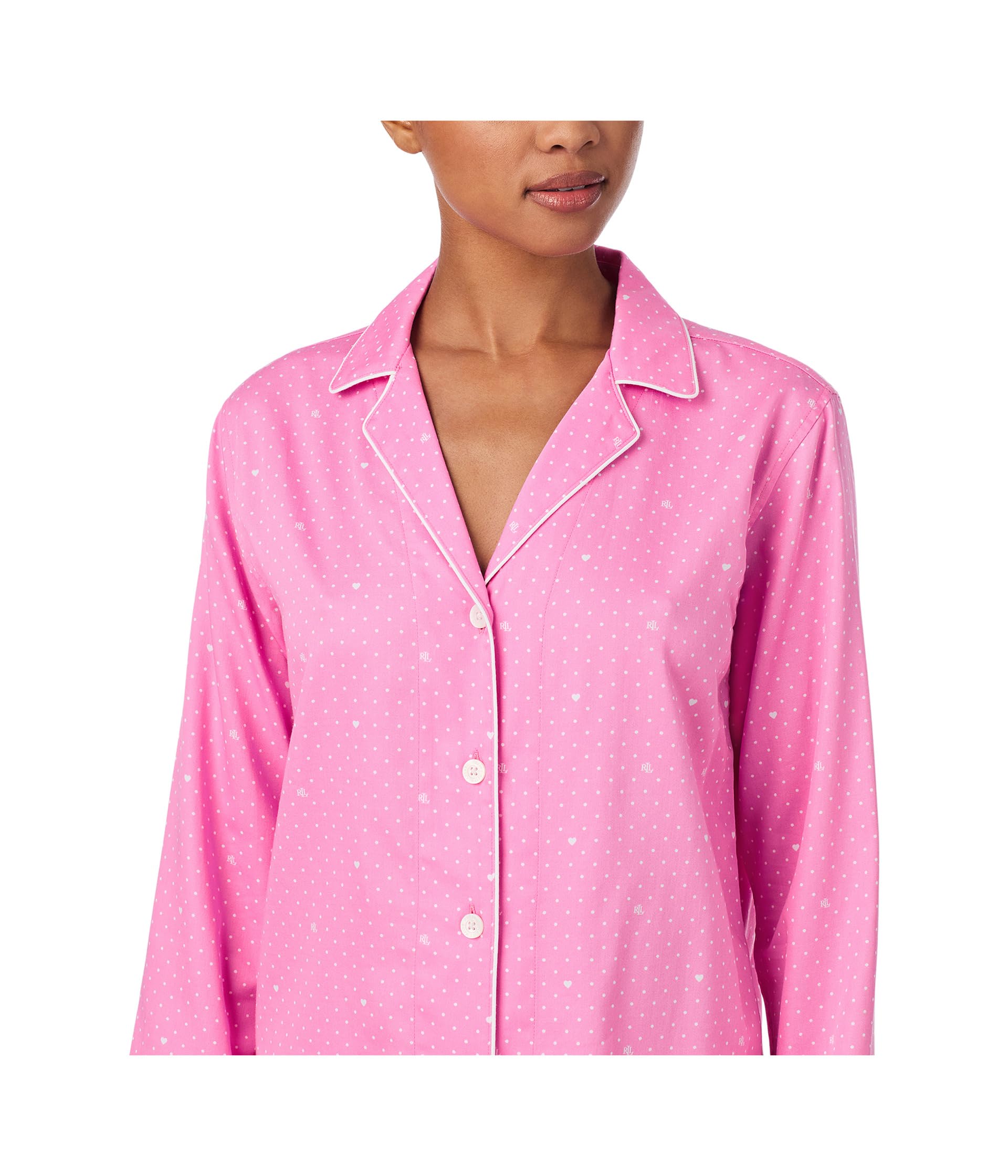This pajama set features a soft pink color with an allover tiny dot print for a sweet and playful sleepwear look. The long sleeve top is designed with a classic notched collar, button-front closure, and contrast white piping, giving it a timeless pajama-inspired finish that feels polished and comfortable. The matching full-length pants complete the set with a relaxed straight-leg silhouette for easy movement and everyday wear.