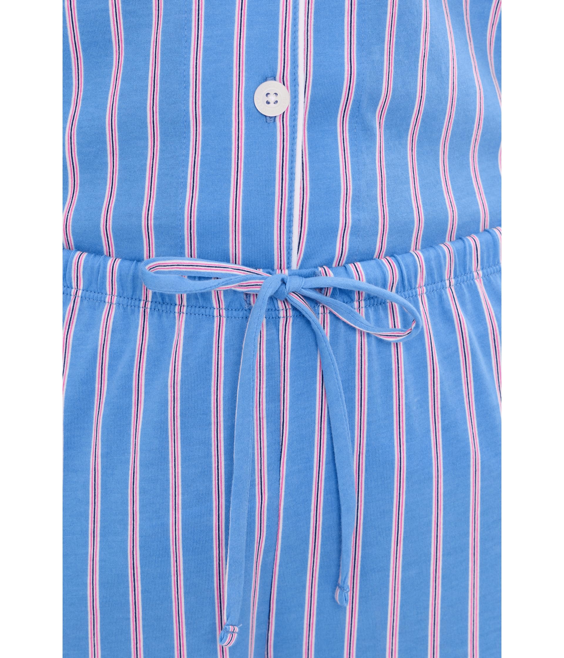 This pajama set features a bright blue base with delicate vertical stripes, creating a fresh and classic pajama look with a soft color-blocking design. The long-sleeved top has a turn-down collar, button front, and contrasting piping on the cuffs. The relaxed fit is both sophisticated and comfortable. The matching straight-leg trousers are suitable for everyday wear and allow for freedom of movement.
