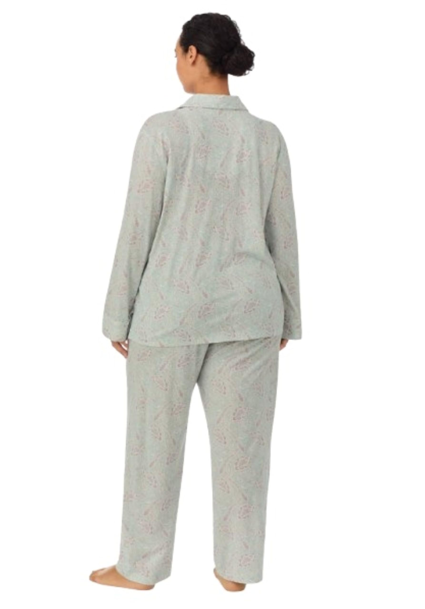 This pajama set features a soft light sage green color with an allover delicate floral-inspired print for a calm and elegant sleepwear look. The long sleeve top is designed with a classic notched collar, button-front closure, and relaxed fit, giving it a timeless pajama style that feels both comfortable and polished. The matching full-length pants complete the set with an easy straight-leg silhouette for everyday lounging and bedtime comfort.