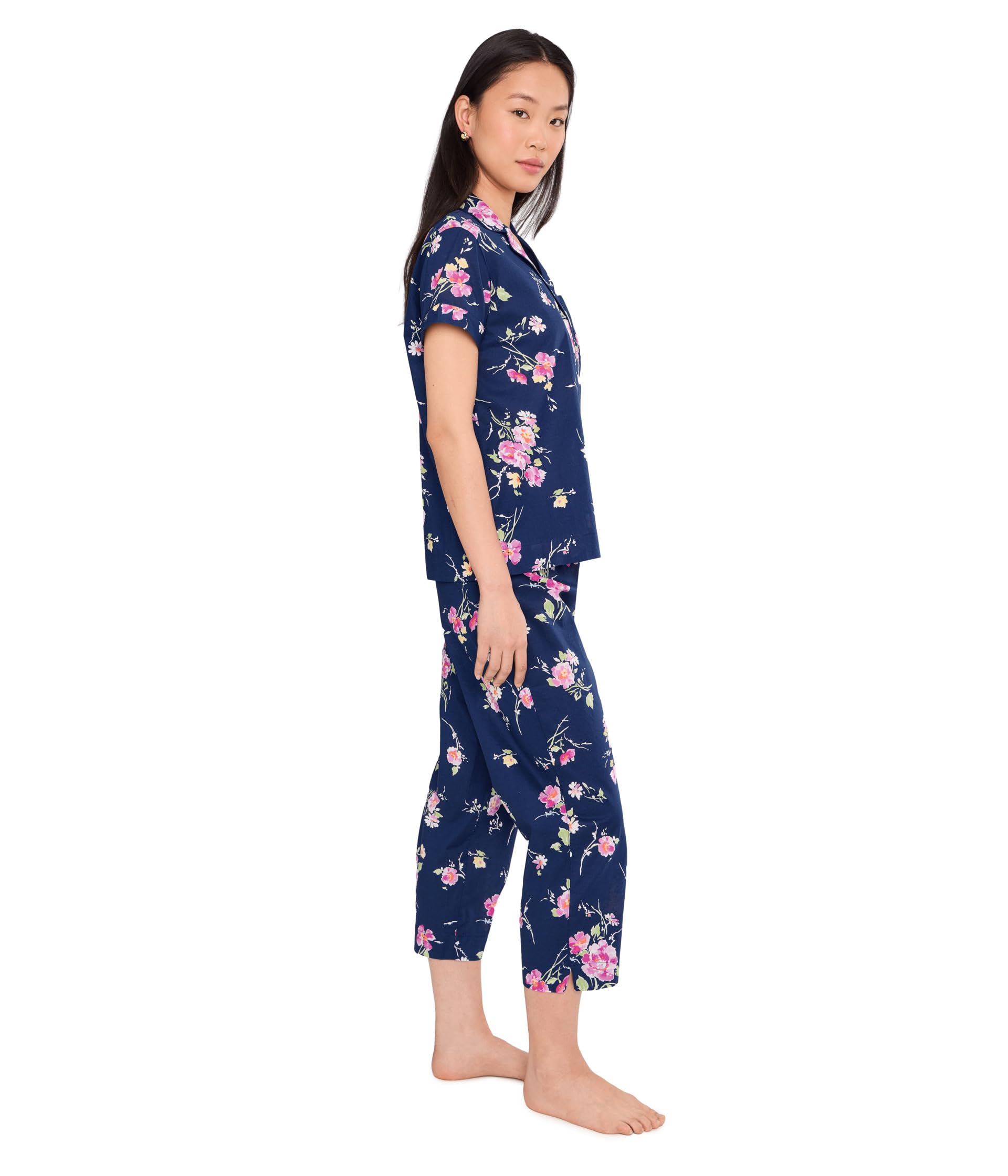 This pajama set features a deep navy blue base with an allover pink floral print and soft green leafy accents for a fresh, feminine look. The short sleeve top is styled with a classic notched collar and button-front closure, giving it a timeless pajama-inspired design that feels both polished and comfortable. The matching pants are cut in a relaxed straight-leg silhouette with a cropped length, making the set feel light, easy to wear, and ideal for everyday lounging.