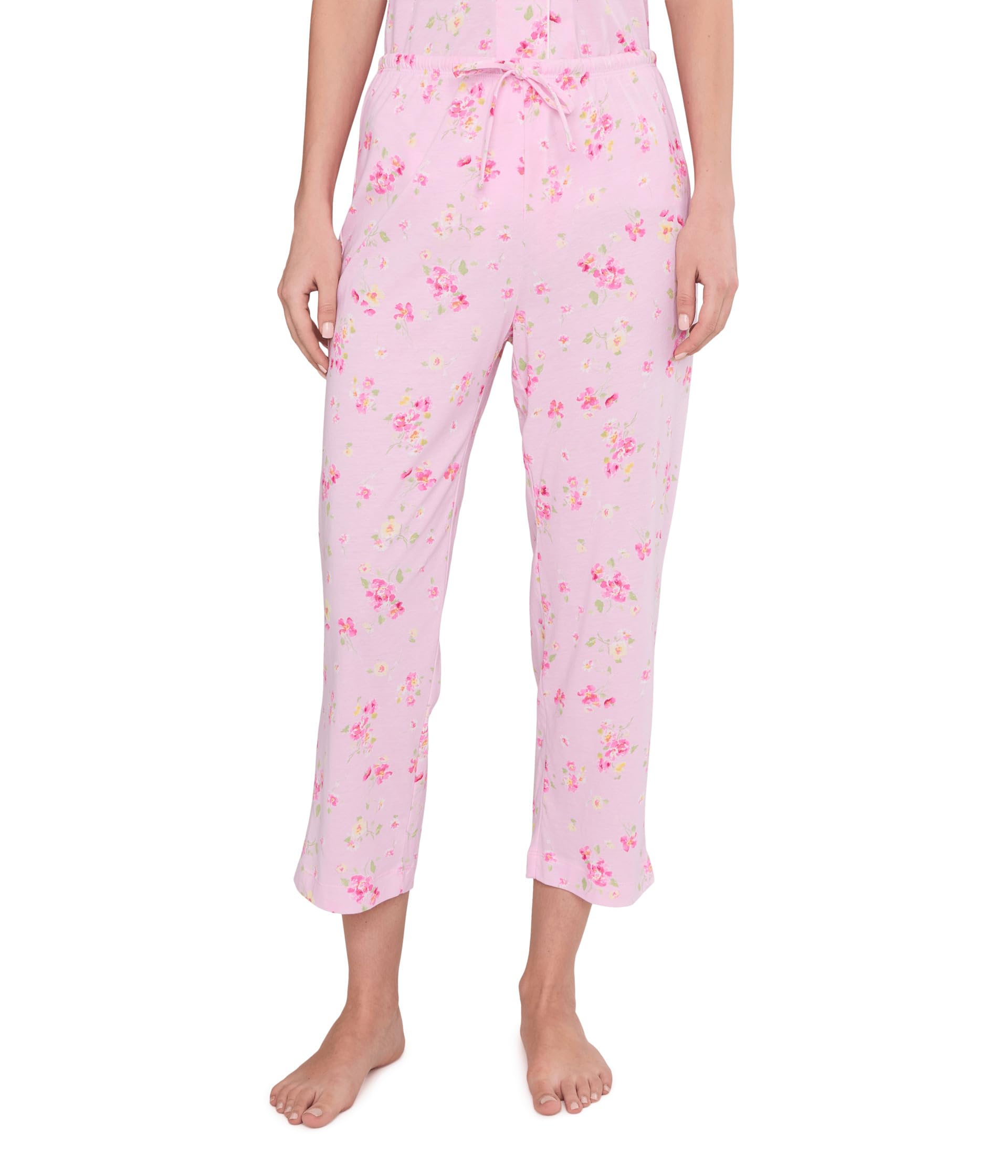 This pajama set features a soft pink color with an allover delicate floral print for a sweet and feminine sleepwear look. The short sleeve top is designed with a classic notched collar, button-front closure, and a relaxed fit that feels easy and comfortable to wear. The matching pants are finished in a cropped straight-leg silhouette, giving the set a light and casual feel that is perfect for everyday lounging and bedtime.