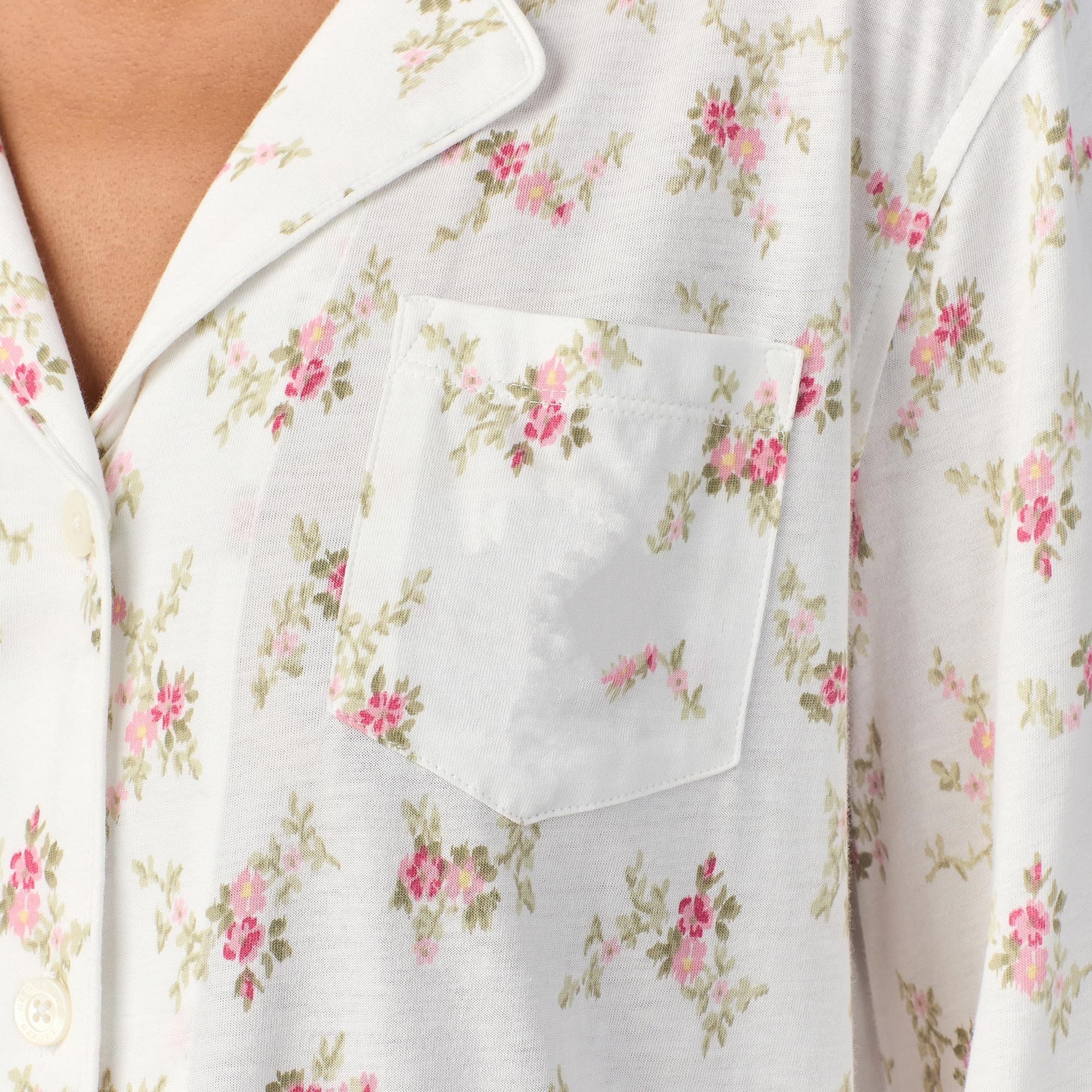 This pajama set features a soft ivory base decorated with a delicate allover floral print in blush pink and muted green tones, creating a sweet and timeless sleepwear look. The long sleeve top is styled with a classic notched collar, button-front closure, and a relaxed silhouette that feels polished while remaining comfortable for everyday wear. The matching full-length pants complete the set with an easy straight-leg shape that works well for sleeping, lounging, and quiet mornings at home.