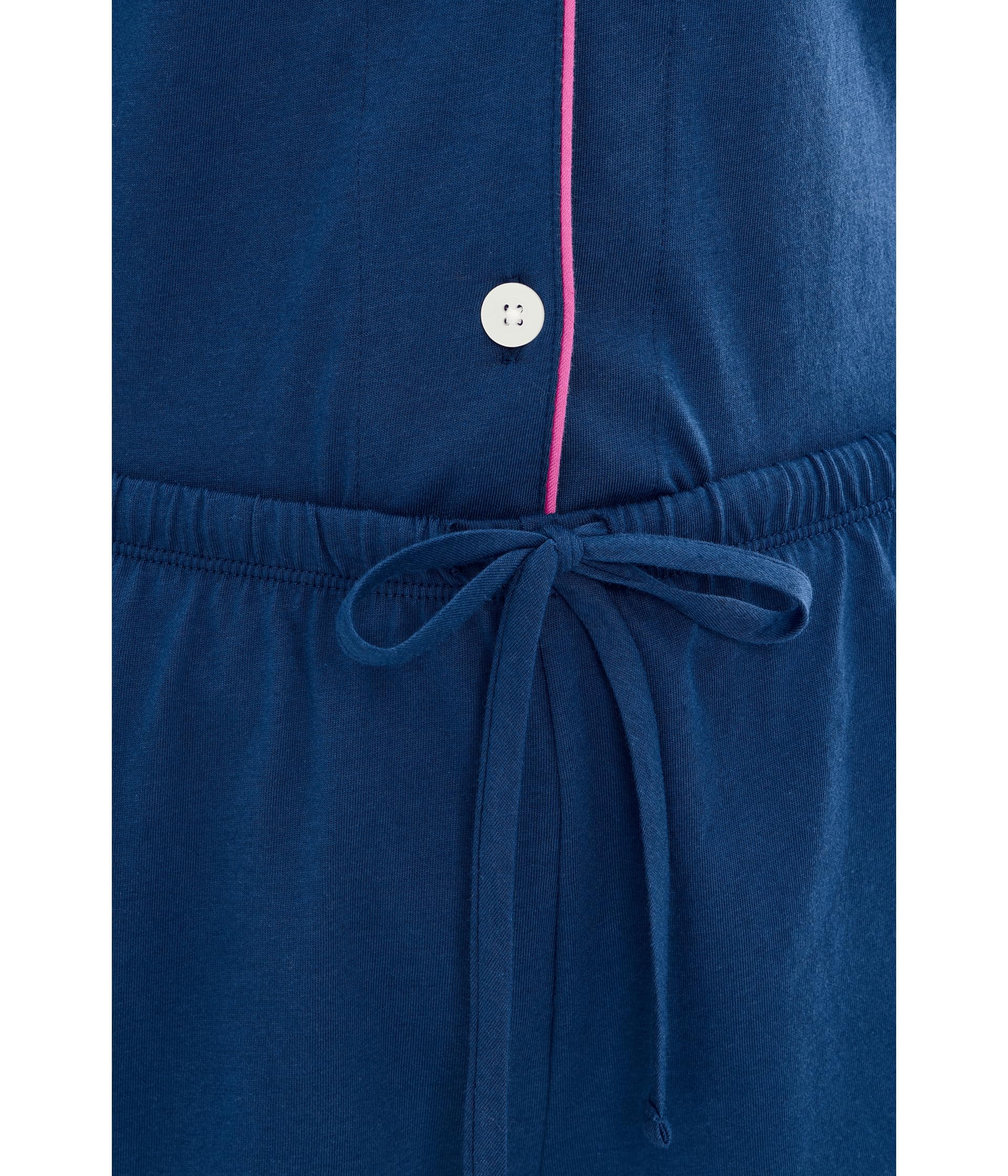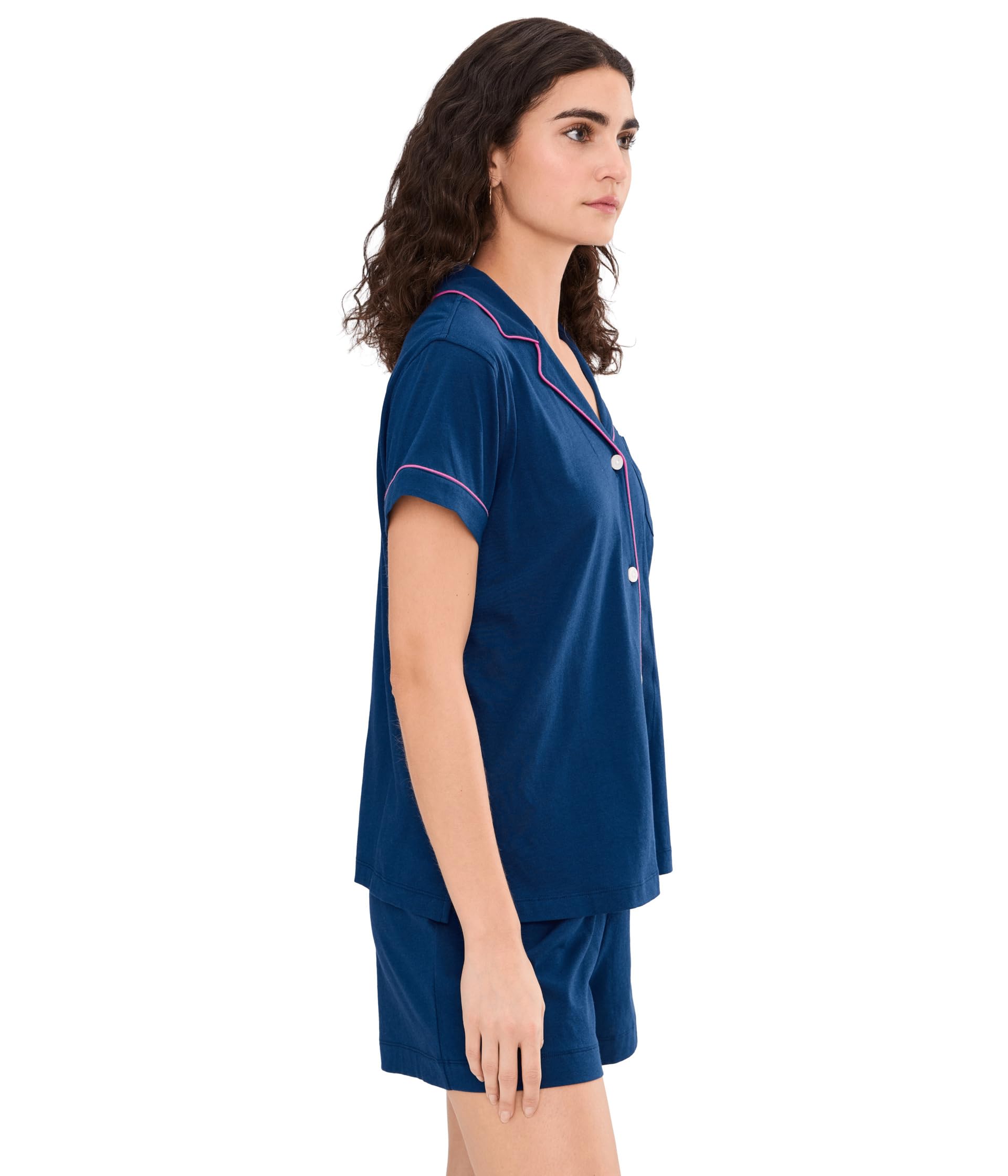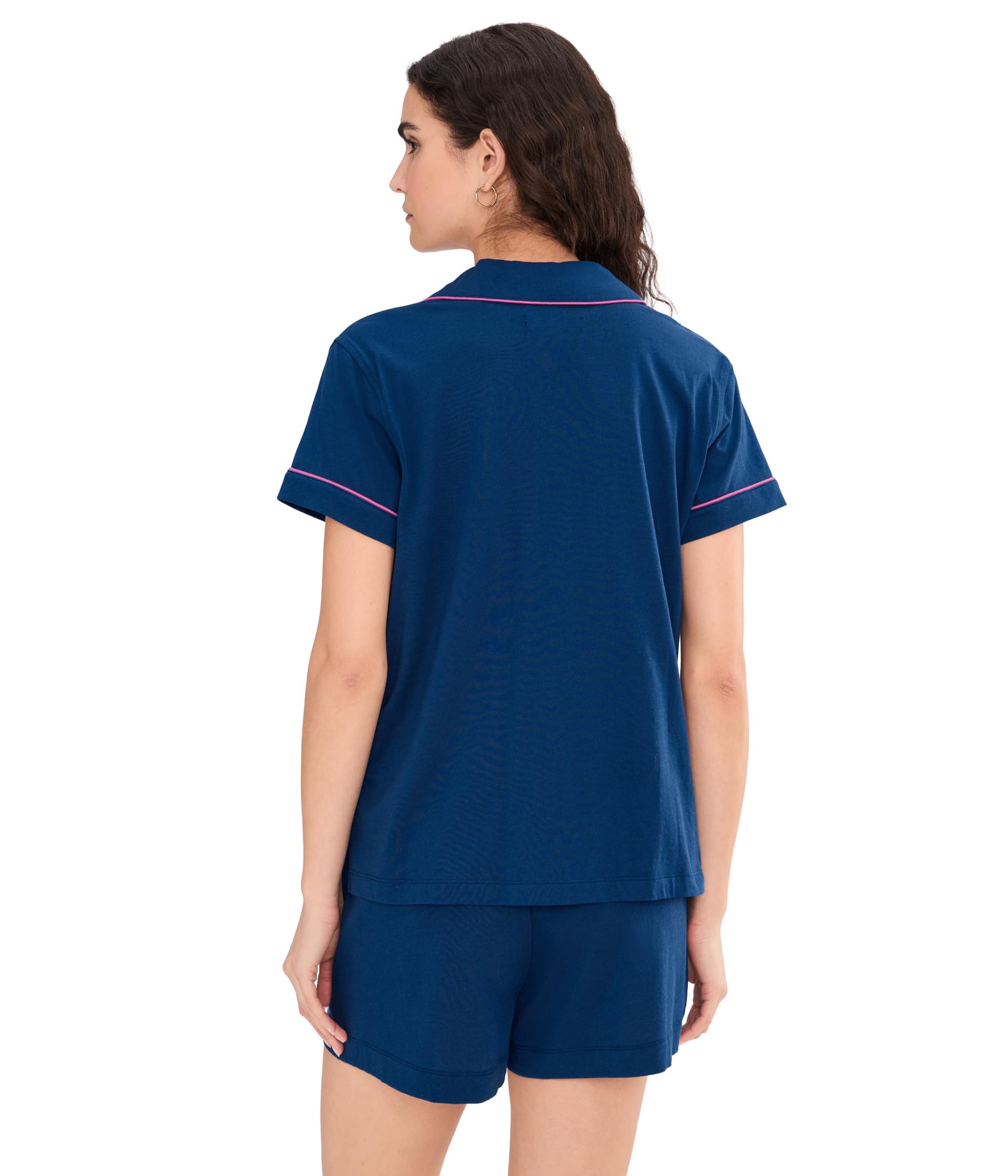 This pajama set features a rich navy blue color accented with bright pink contrast piping for a crisp and modern sleepwear look. The short sleeve top is designed with a classic notched collar, button-front closure, chest pocket, and a relaxed fit that feels polished yet comfortable. The matching shorts complete the set with an easy silhouette that is ideal for warm nights and laid-back lounging.