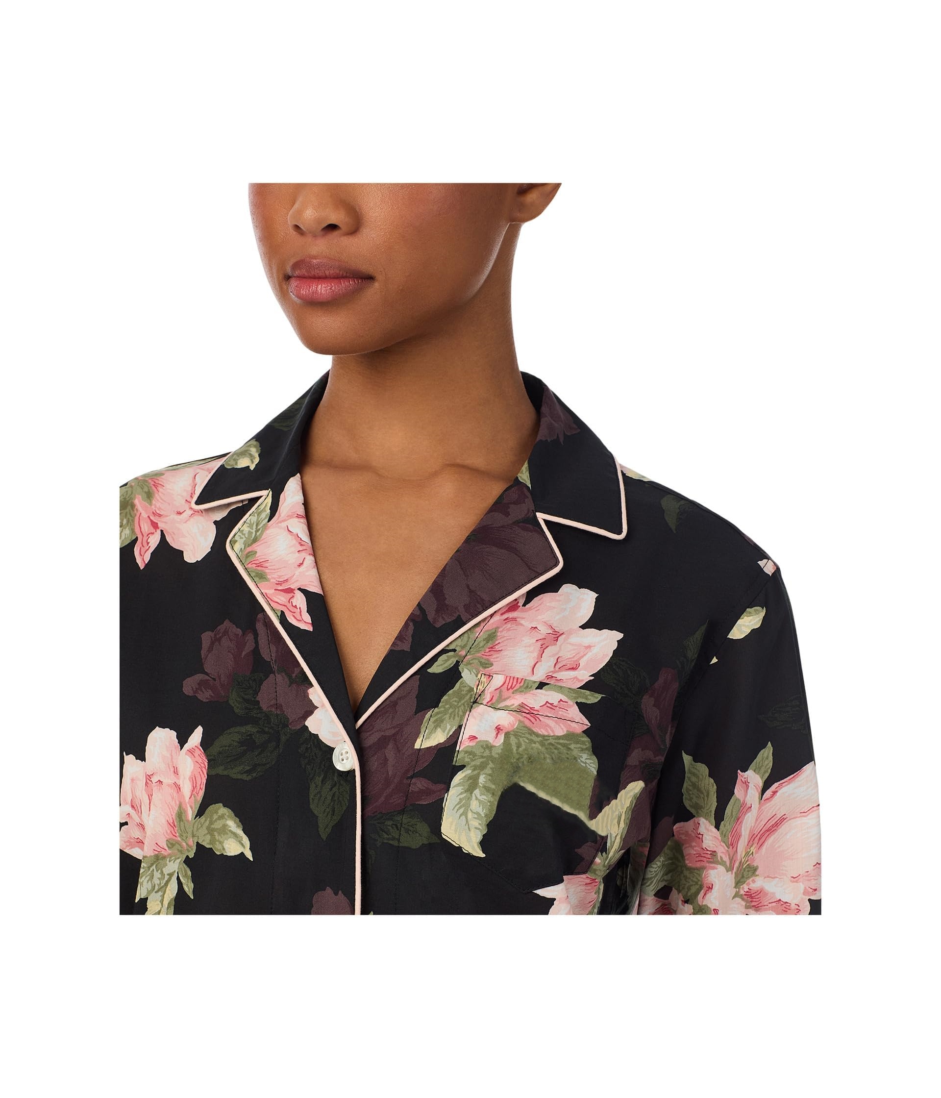 This pajama set features a rich black base with an allover large-scale floral print in soft pink, ivory, and muted green tones for an elegant and romantic sleepwear look. The long sleeve top is designed with a classic notched collar, button-front closure, contrast piping, and a relaxed silhouette that feels polished yet comfortable. The matching full-length pants complete the set with an easy straight-leg shape for comfortable movement and a coordinated finish.