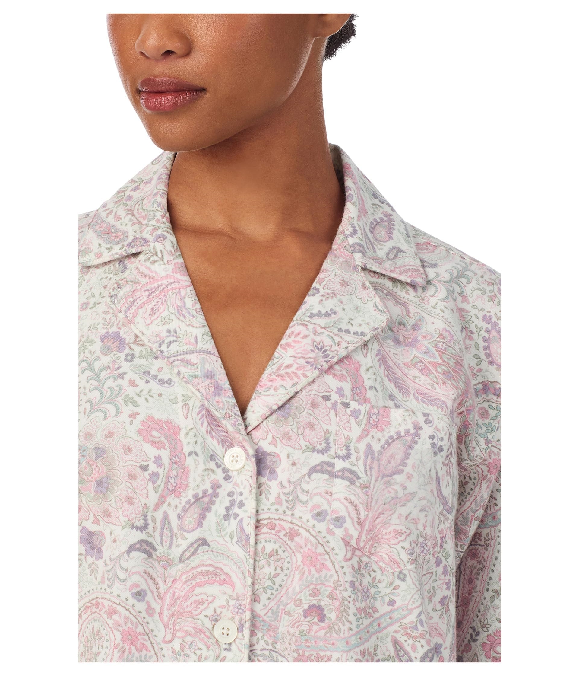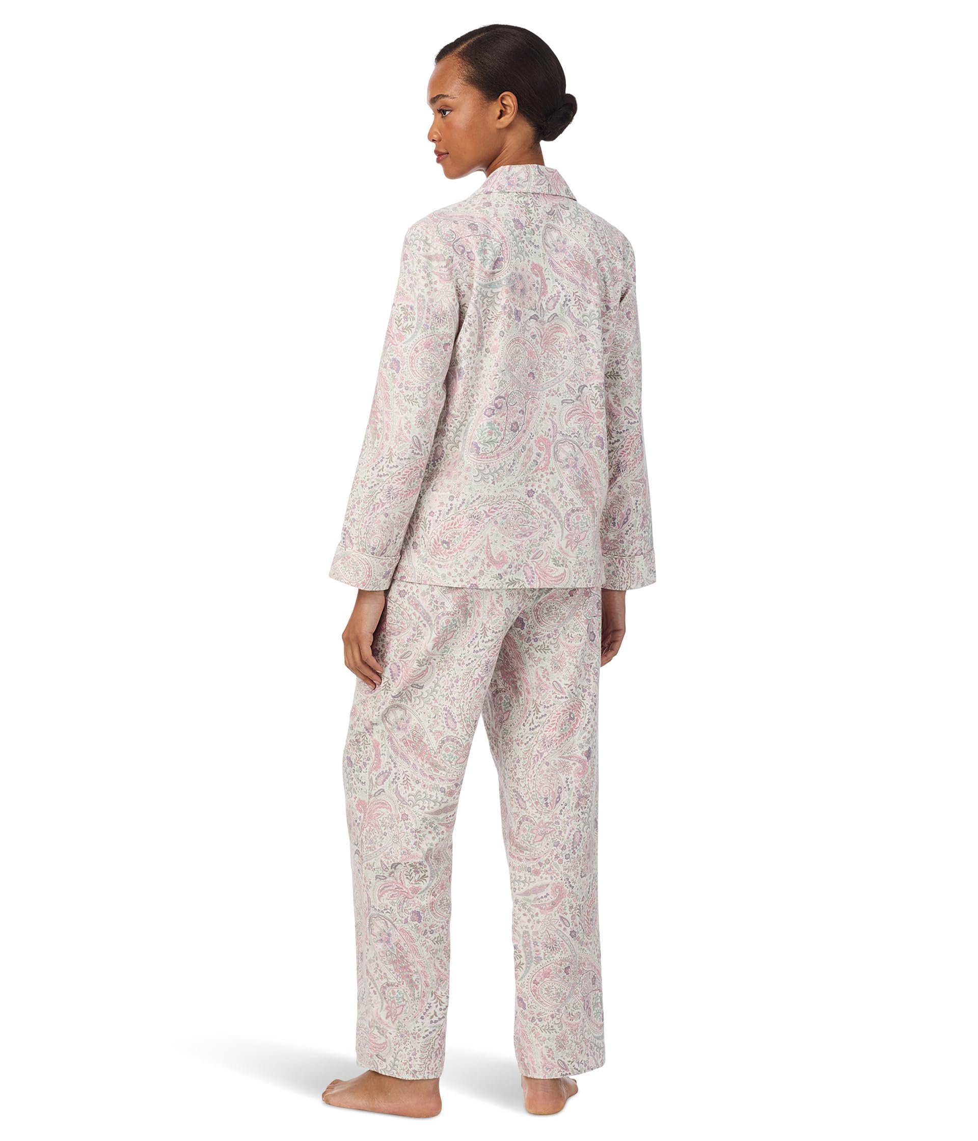 This pajama set features a soft ivory base with an allover paisley print in blush pink and light sage tones for an elegant, feminine sleepwear look. The long sleeve top is designed with a classic notched collar, button-front closure, and a relaxed silhouette that feels polished while staying comfortable for everyday wear. The matching full-length pants complete the set with an easy straight-leg shape, creating a coordinated look that is ideal for sleeping and lounging.